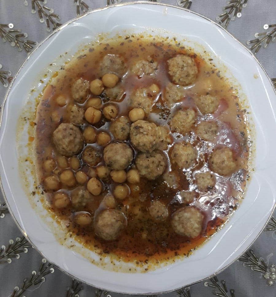 yuvarlandıktan sonra buzdolabında dinlendirilir. Pişmiş nohuta ilave edilir. Yaklaşık 10-15 dk da birlikte pişirilir. Su azalırsa sıcak su eklenebilir.